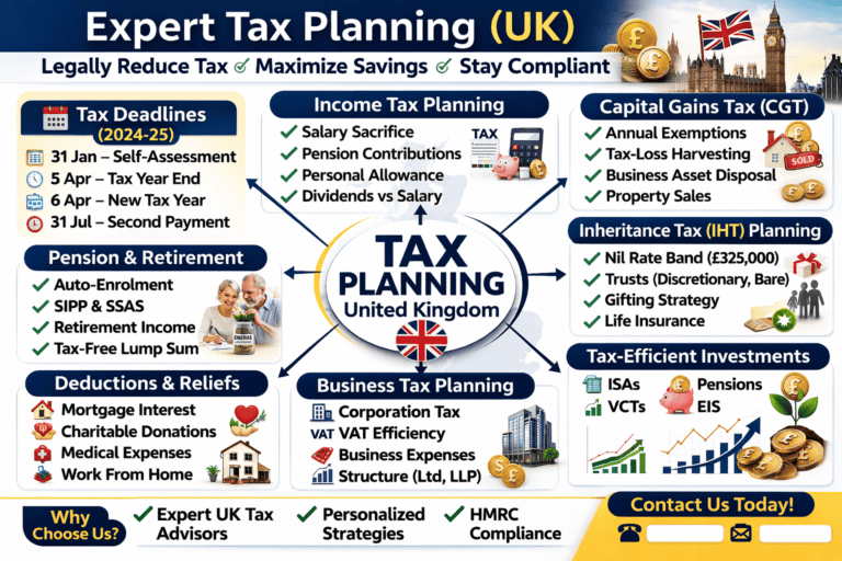 Tax planning in the UK focuses on arranging financial matters legally to optimise the use of reliefs, allowances, and exemptions. This includes utilising ISAs, contributing to pensions, and claiming marriage allowances to lower Income Tax, Capital Gains Tax, and Inheritance Tax.